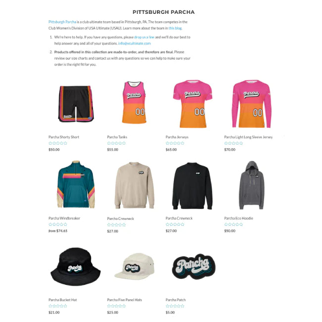Un magasin d'équipe VC vous permet de proposer n'importe quel article que nous fabriquons et de faire passer des commandes individuellement (plus besoin de collecter de l'argent pour les goodies !), ainsi que la possibilité d'offrir les vêtements de votre équipe à la communauté élargie en tant que collecte de fonds. Notre équipe de designers professionnels est prête à réaliser vos rêves.
