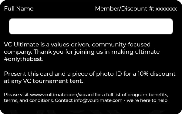 Les cartes VC bénévoles vous offrent tous les mêmes avantages que le programme d'adhésion à la carte VC, à l'exception du crédit en magasin. S'il vous plaît contactez info@vcultimate.com pour enregistrer votre adhésion à la carte VC.